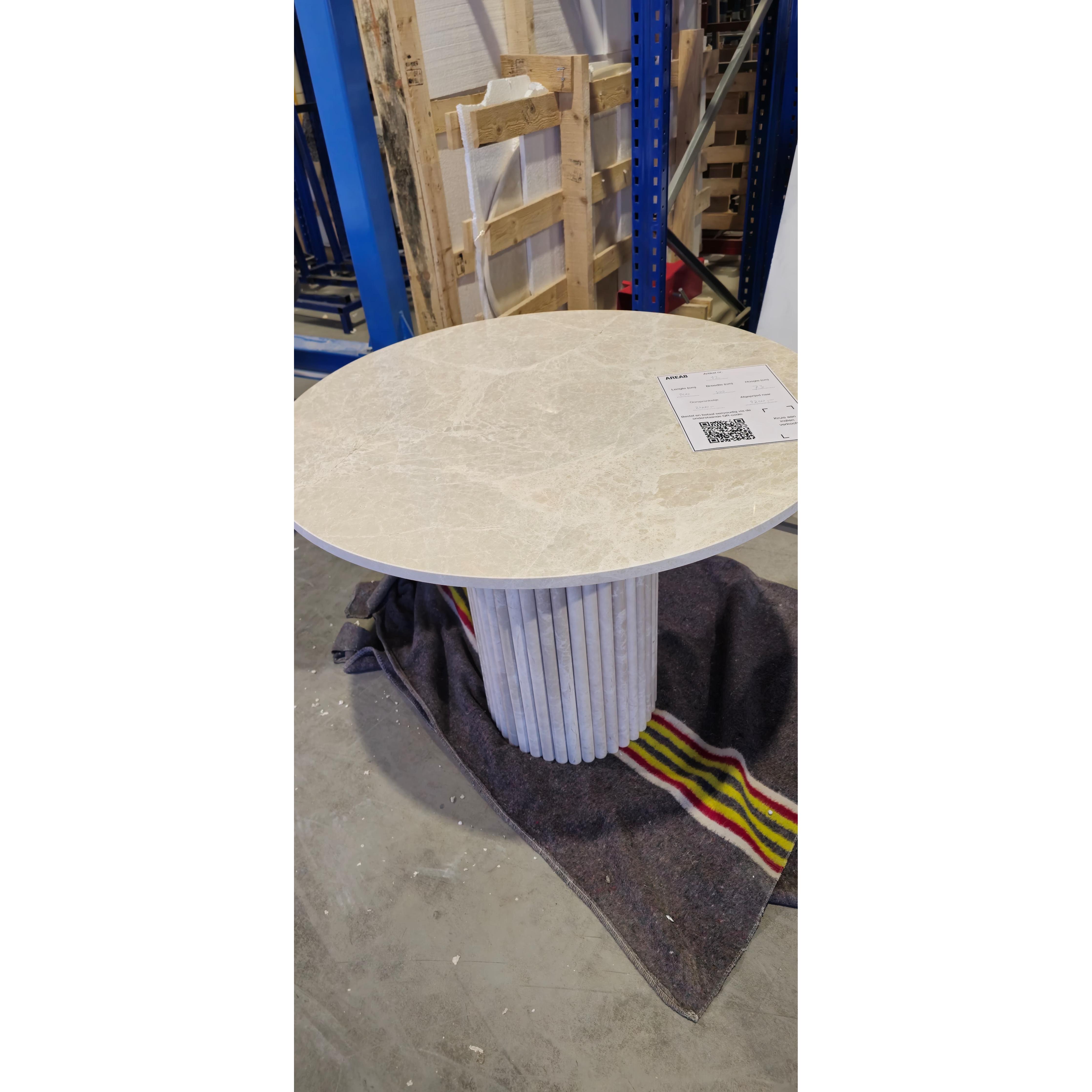 Der runde Esstisch aus Vanillemarmor mit einem Sockel aus geriffeltem Marmor hat eine elegante Ausstrahlung und ist in gutem Zustand. Es sind leichte Gebrauchsspuren und einige kleine Herstellungsfehler sichtbar, die aber den Charme des Tisches nicht beeinträchtigen. Das raffinierte Design macht den Tisch zu einer wunderbaren Ergänzung sowohl für moderne als auch für klassische Esszimmer.