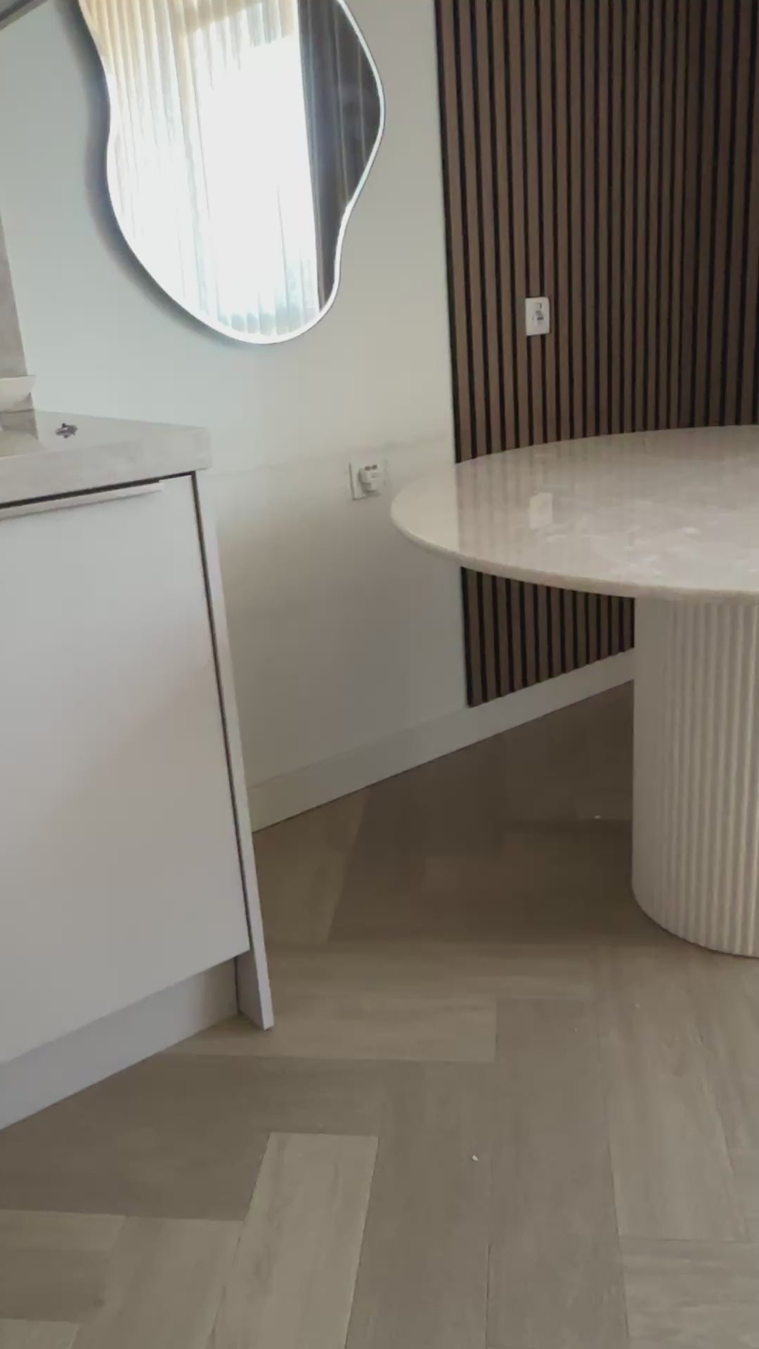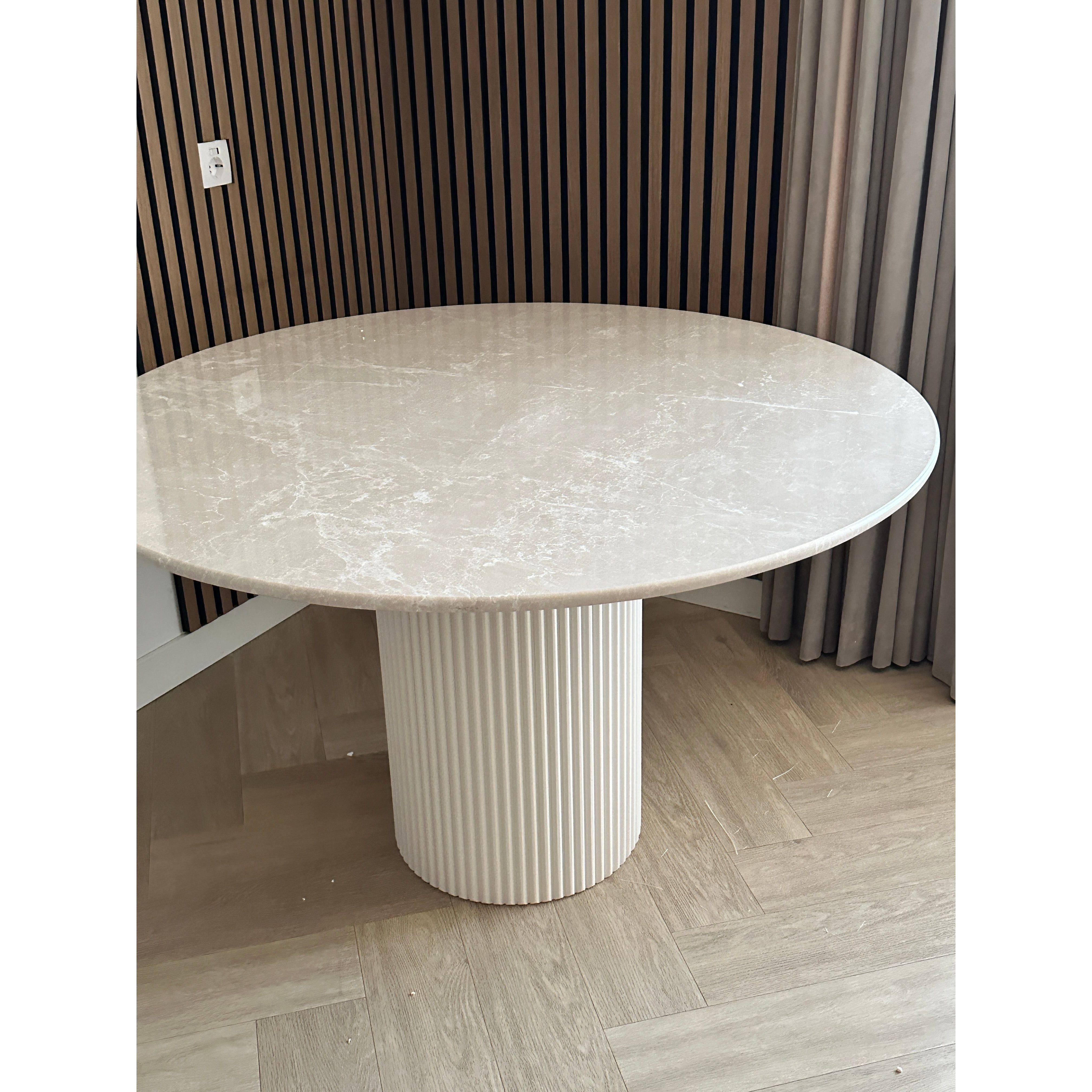 Der runde Esstisch aus Vanillemarmor verbindet polierten Luxus mit elegantem Design. Der Ripple-Holzfuß verleiht dem Tisch einen warmen und einzigartigen Look, perfekt für ein stilvolles Esszimmer.